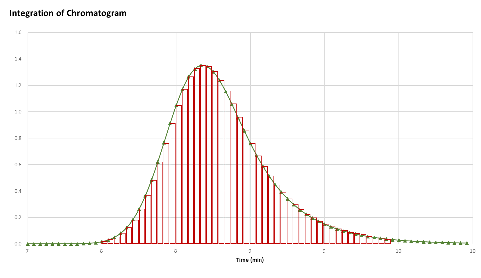 크로마토그램 피크의 면적을 계산하는 방법을 적분 (Integration)을 하면 값을 얻을 수 있다.
