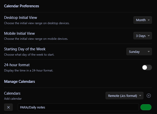 옵시디언 플러그인 Full Calendar 설정으로 들어가면,