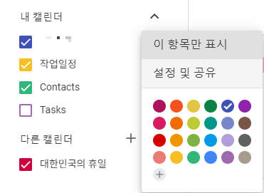 (설정 및 공유 메뉴가 보이지 않는 캘린더는 연동이 불가하다.)