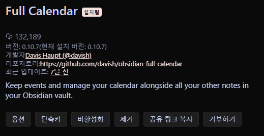 탐색 창에서 Full Calendar 플러그인을 설치하고, 활성화 한다.