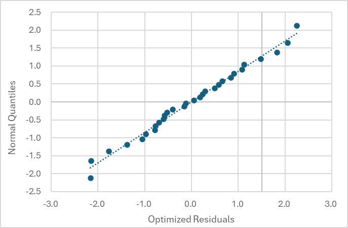 데밍 회귀 수식에서 계산된 최적 잔차 (Optimal Residual) 값의 정규성을 검증하였다.