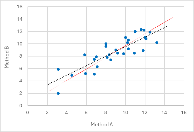 | b | 0.3292 | Intercept of Deming regression line | $= ẏ - a \times ẋ$ |