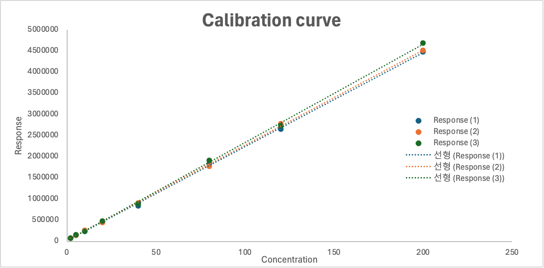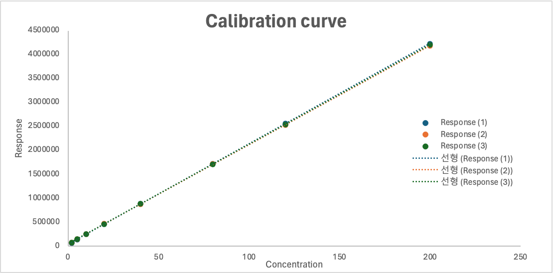 장비 반응값의 범위가 잔차 범위보다 크기 때문에 검정곡선에서는 잔차의 내용이 잘 확인되지 않기 때문이다.
