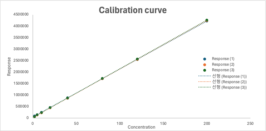 검정곡선의 결정계수가 1에 가까운 값으로 계산되었지만,