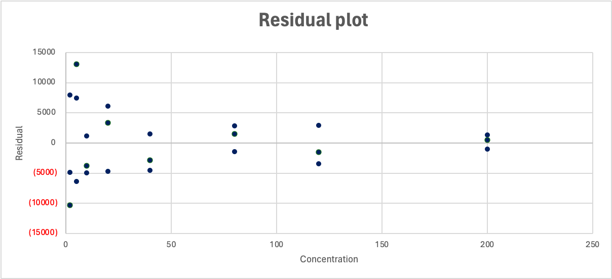 해당 검정곡선의 잔차도는 높은 농도에서 잔차 편차가 증가하는 시스템 오류가 나타났다.