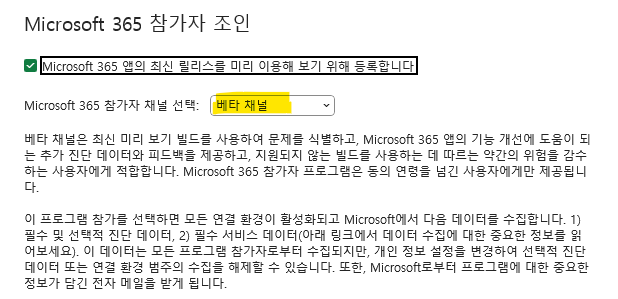 기존 엑셀 버전을 베타버전으로 업그레이드 하면
