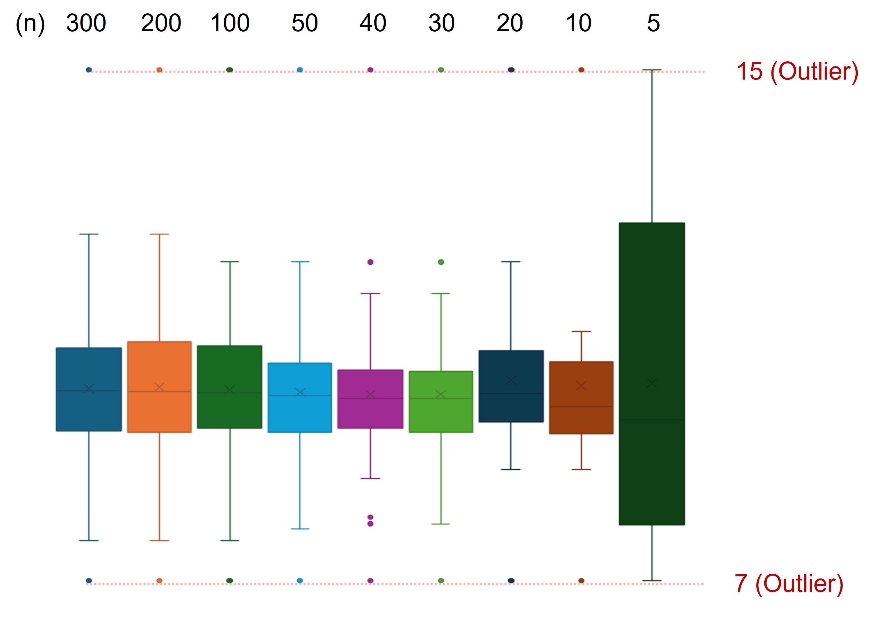 낮은 데이터의 개수에서는 데이터의 분포에 따라서 이상치가 다르게 설정될 수 있으므로 주의가 필요하다.