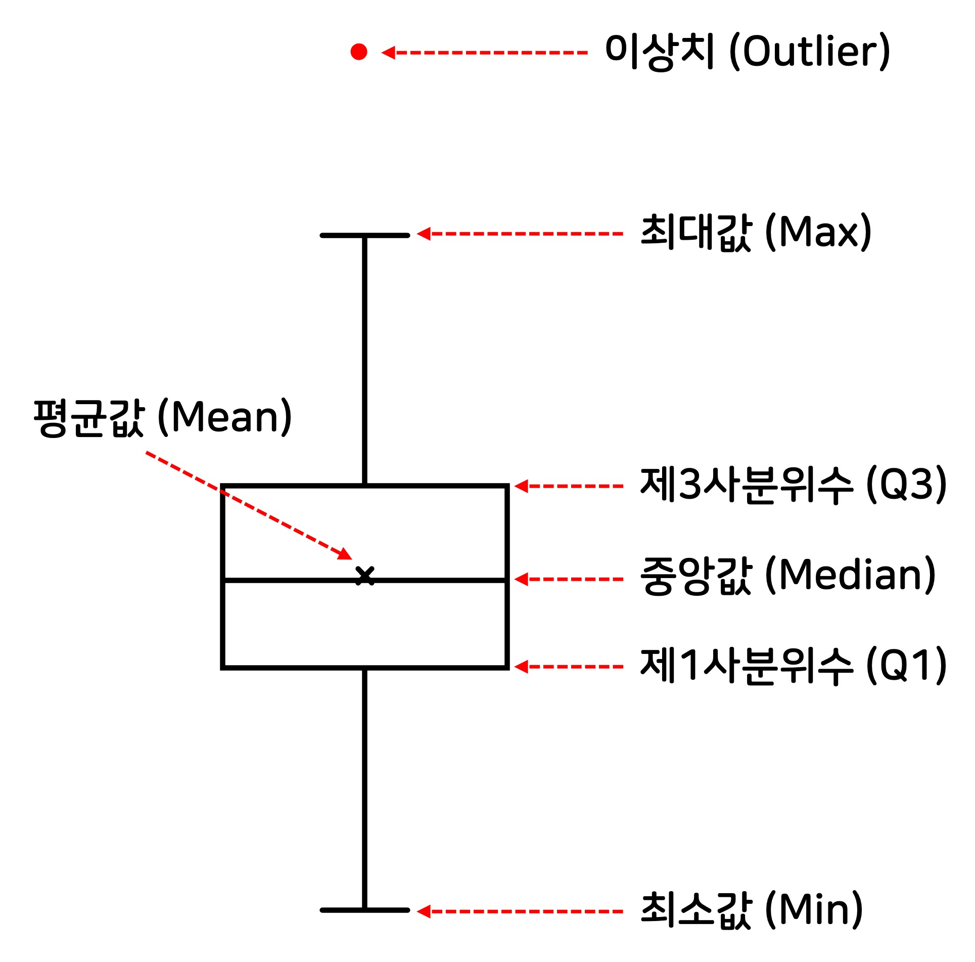 먼저 상자 수염의 구성을 이해하는 것이 필요하다.