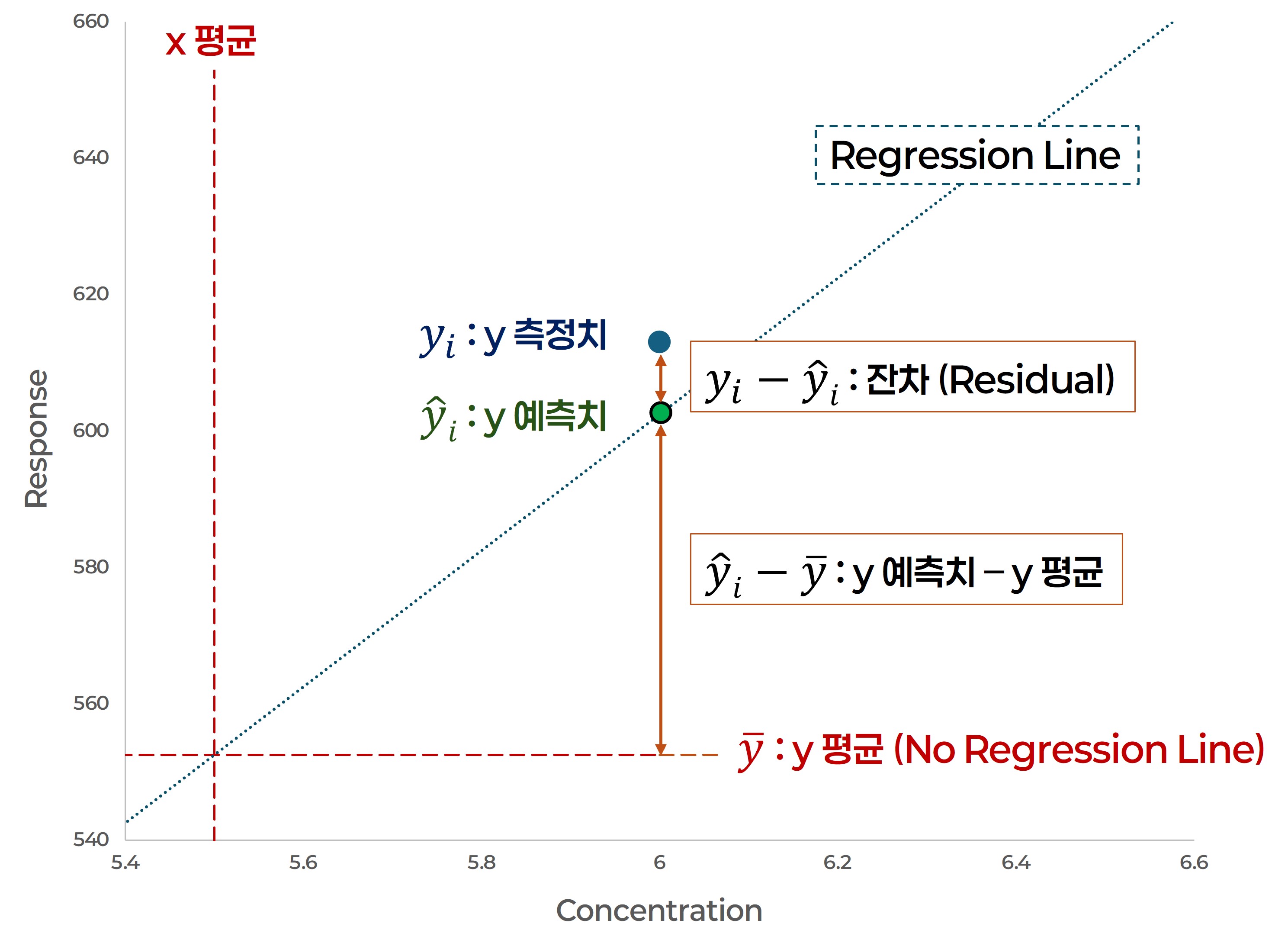 $\hat{y}_i$는 x 값에 대응하는 회귀분석 수식으로 계산된 y 값이고,