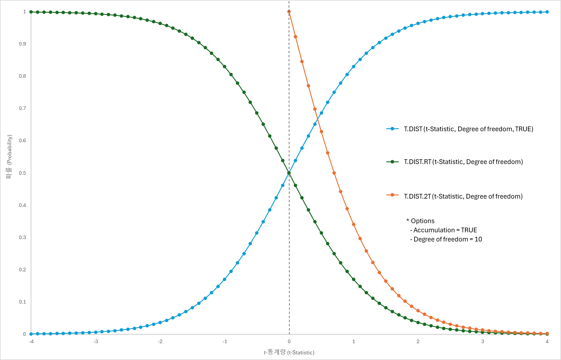 그래서 대칭인 t-분포의 특징을 고려해서 두 값을 합한 누적함수를 엑셀에서 제공한다.