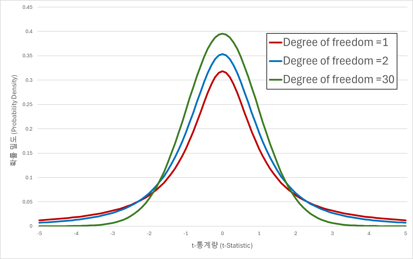 t-분포의 그래프를 변경시키는 매개변수는 자유도 (Degree of freedom)이다.