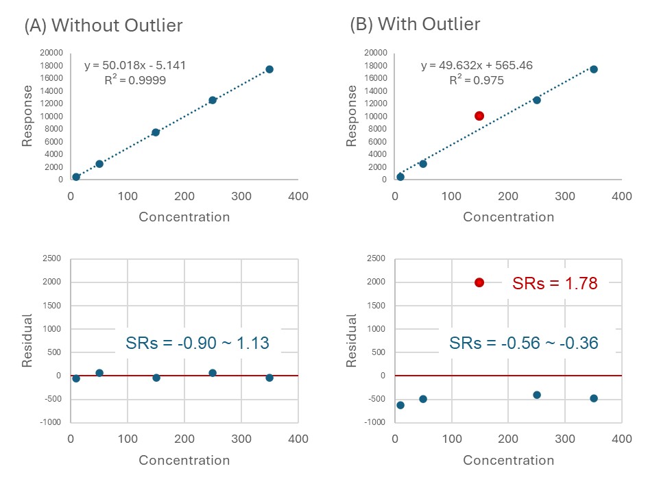 일반적인 검정곡선 예시로 $SRs_i$ 값과 이상치를 평가해 보았다.