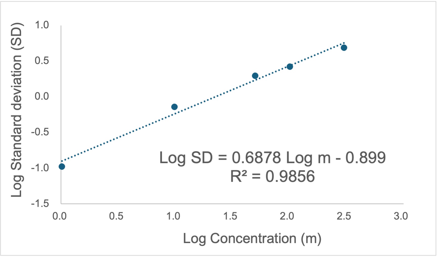 지수 함수 관계로 로그 스케일에서 기울기(c)는 변형된 RSD를 나타내고, 절편(d)은 변형된 고정 SD를 나타낸다.