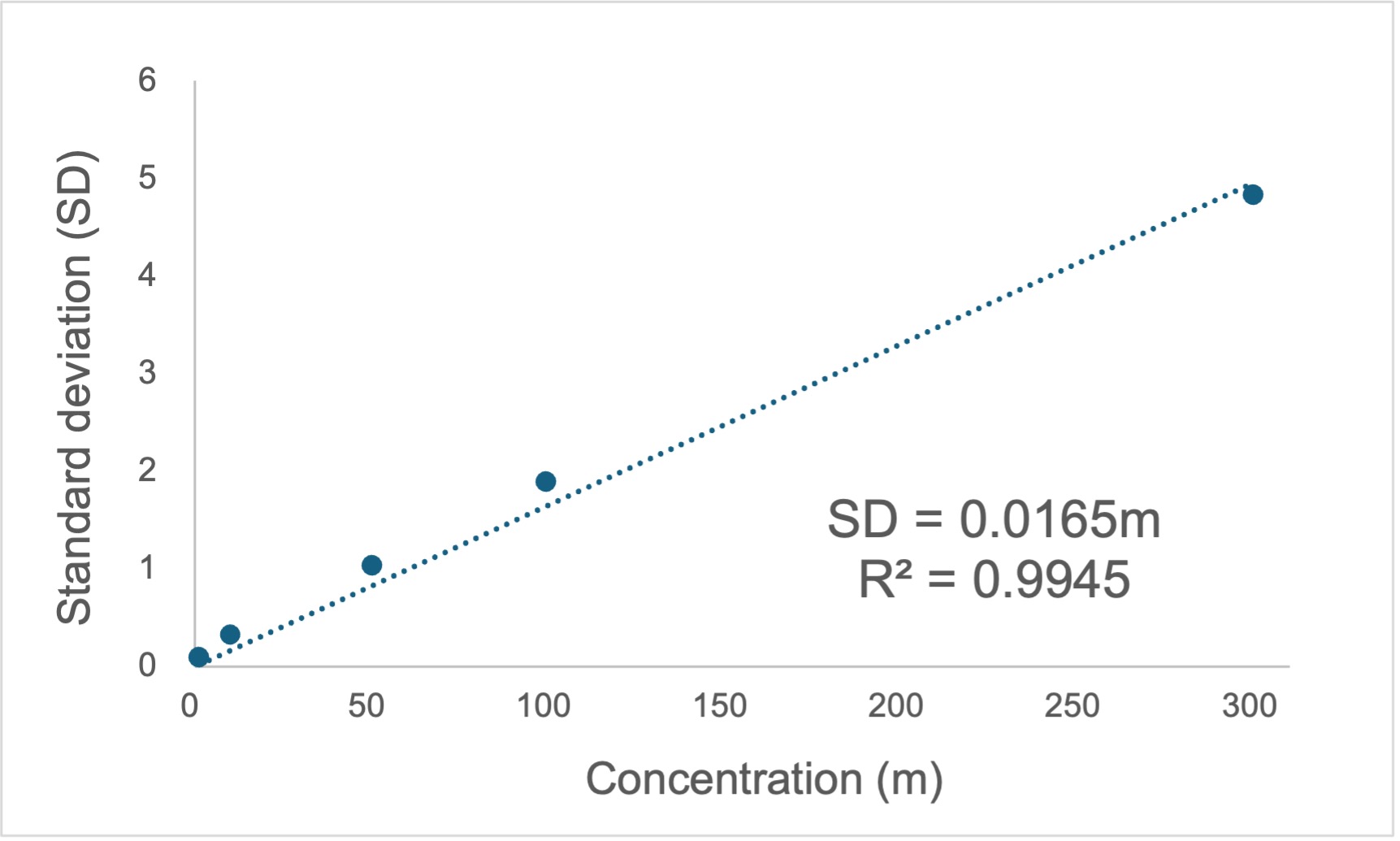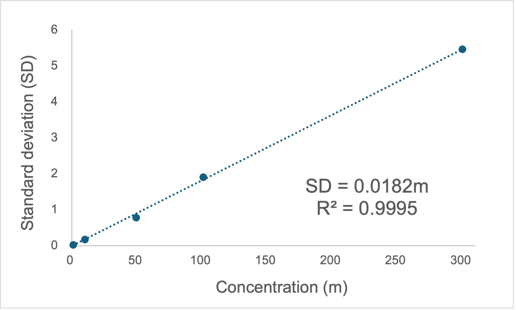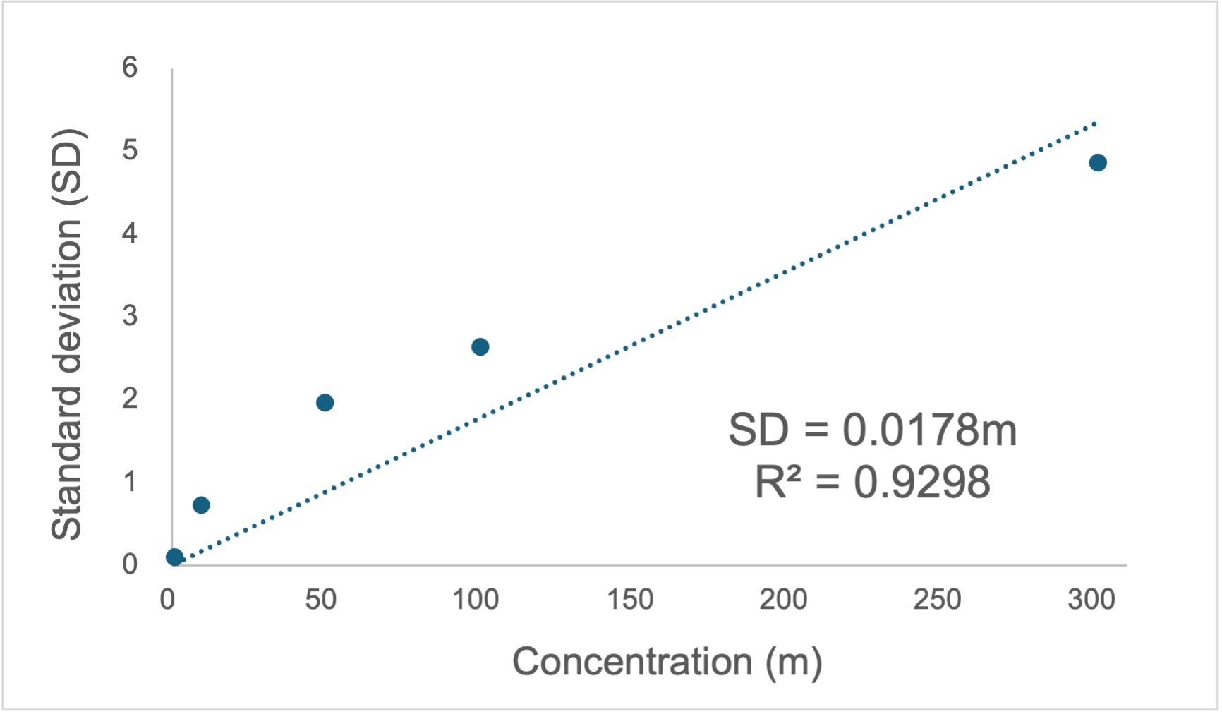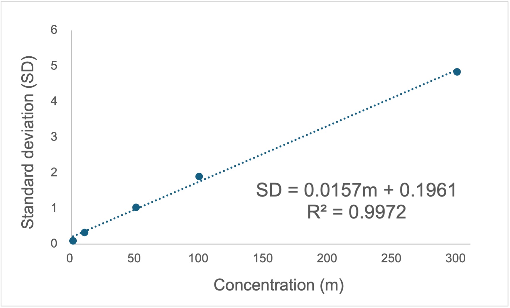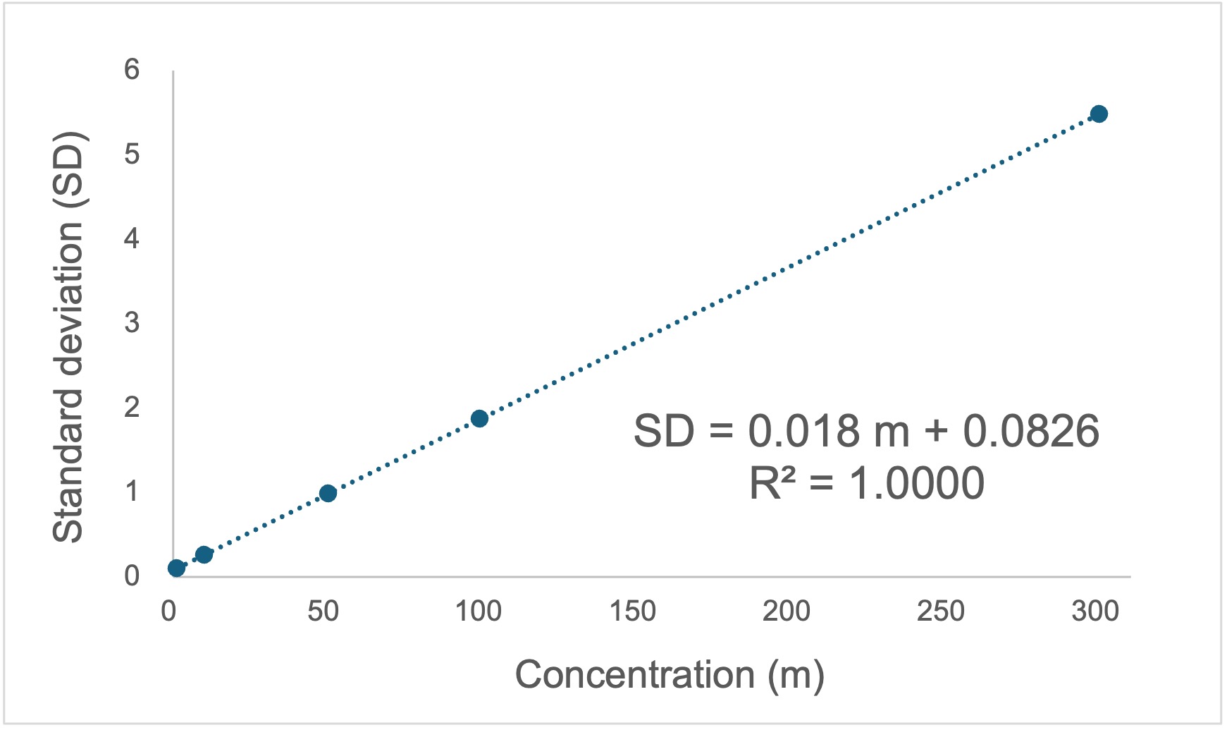 직선 수식의 기울기(a)는 $SD/m$ 으로 정리되며 범위에서 m의 RSD를 나타낸다.