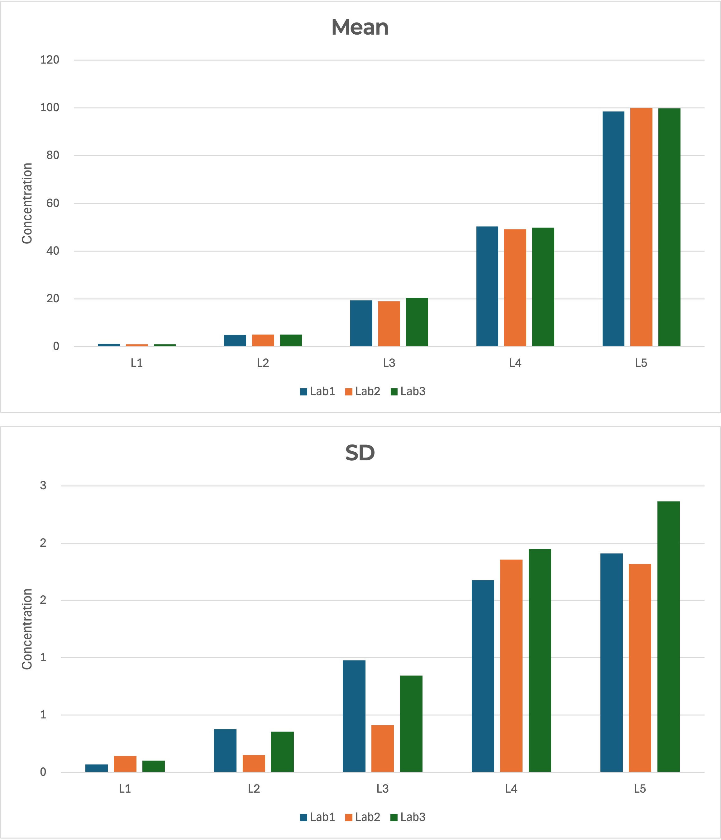 실험실 간 비교 데이터 (실험실: 3개, 샘플 농도: 5개)의 모든 평균과 표준편차를 그래프로 작성하면 아래와 같이 나타난다.