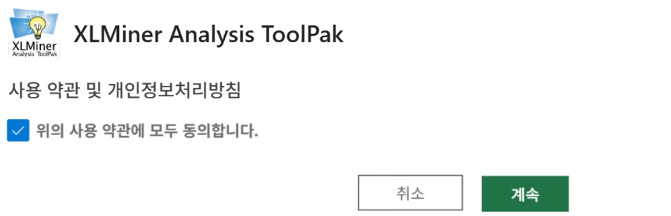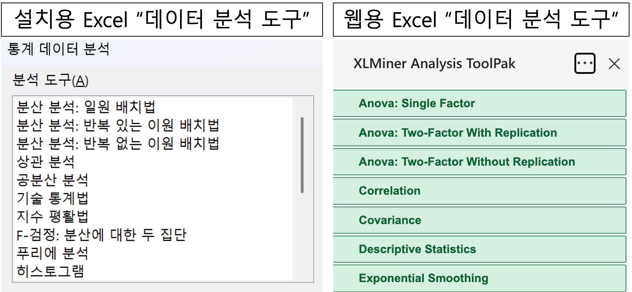 설치용 Excel의 "데이터 분석 도구"와 "XLMiner Analysis ToolPak"은