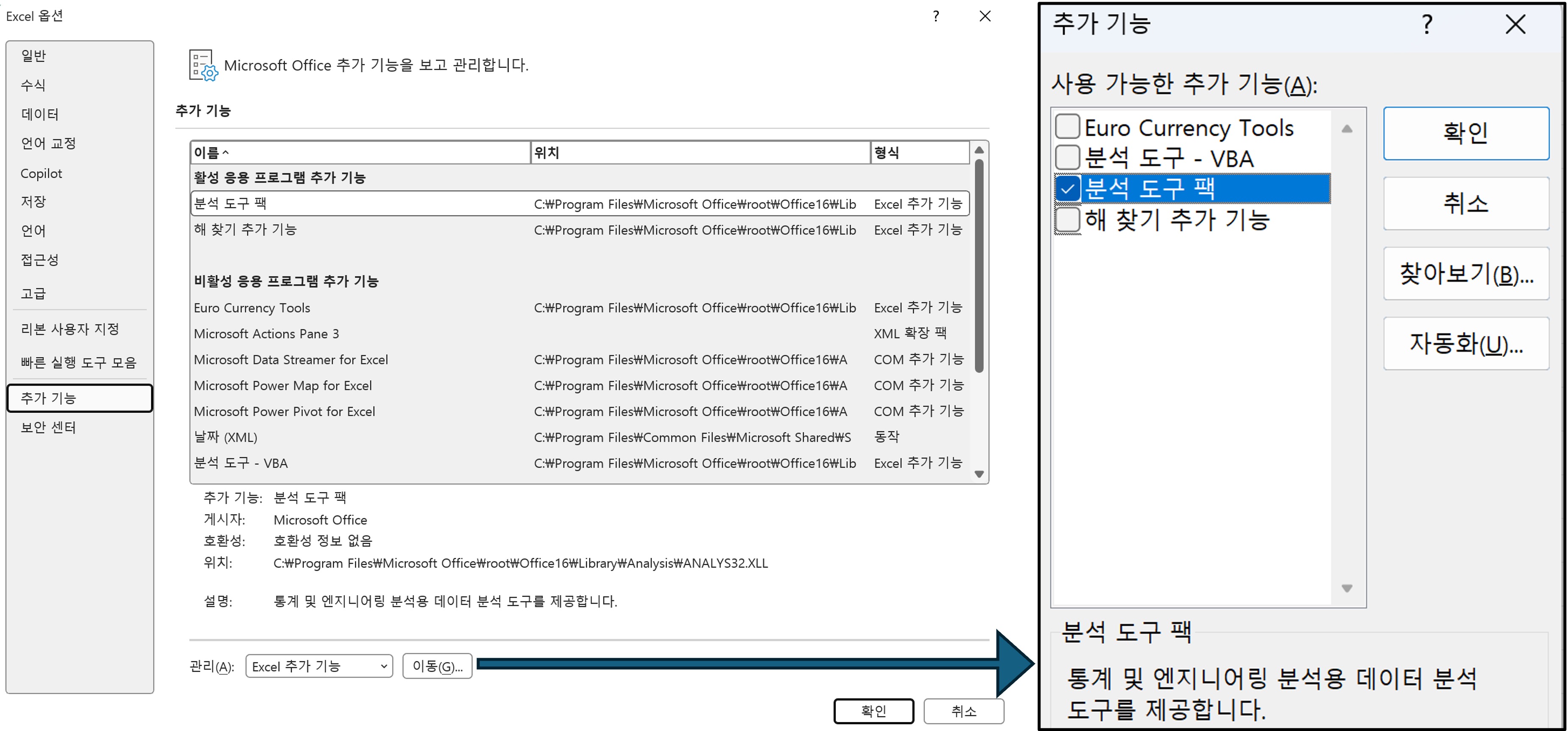 [Excel 메뉴] 파일 > 옵션 > 추가기능 > Excel 추가 기능 | 이동 > "분석 도구 팩" (체크) | 확인